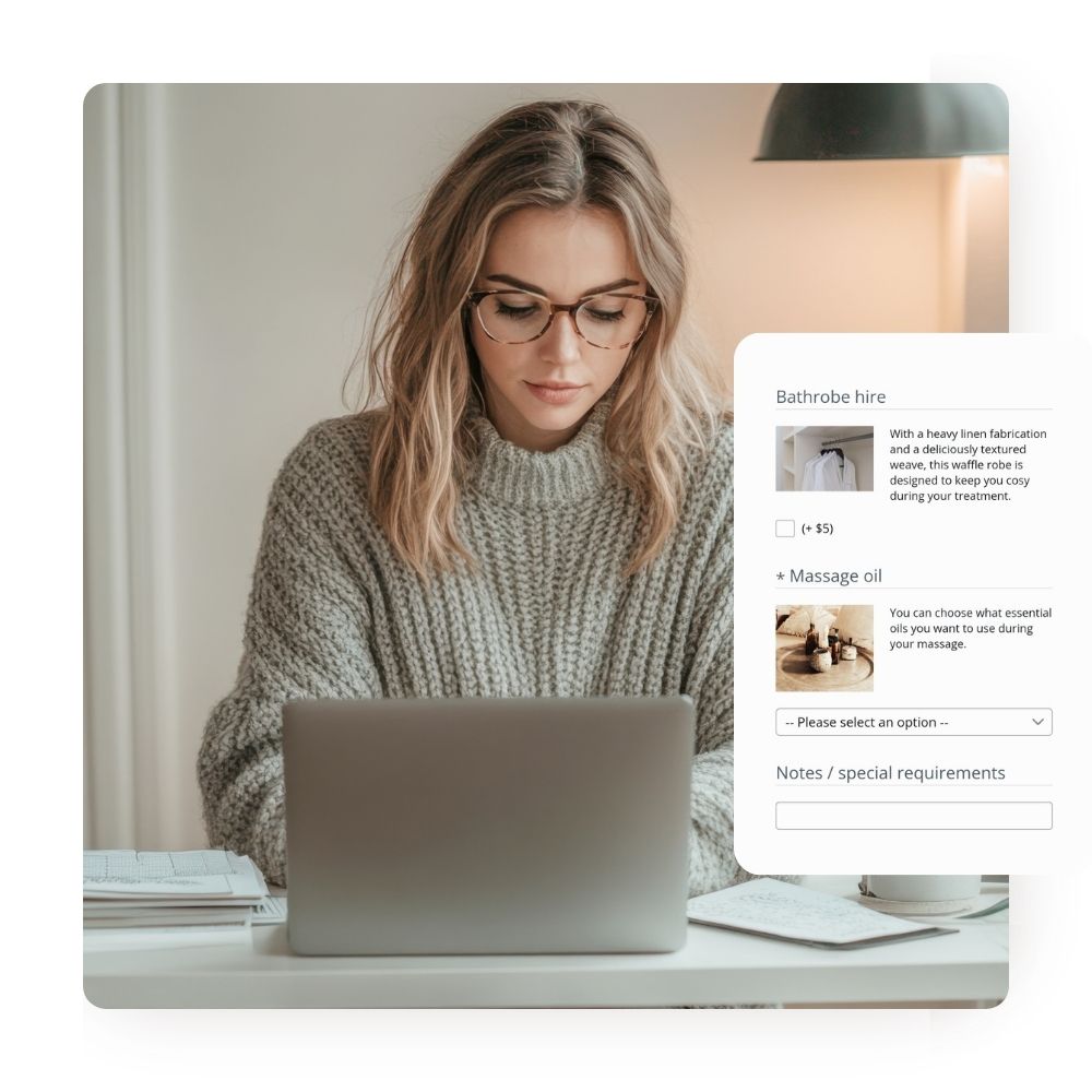 Sell multiple services with the integrated booking cart. Upsell services and workshops with extras and options.