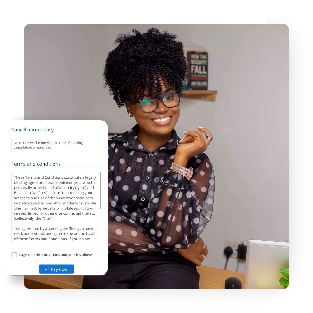 Ahórrate la batalla de los formularios con términos y condiciones y políticas de cancelación. Tus clientes deberán aceptarlos para completar sus reservas de citas o talleres en línea.