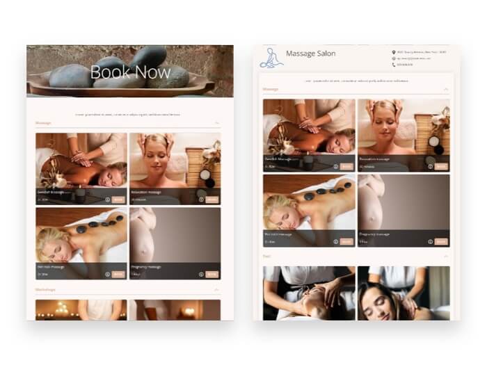 Para aceptar reservas de masajes, puedes utilizar la página de reservas personalizable de Bookeo o puedes integrar el widget de Bookeo en tu sitio web, para que tus clientes puedan reservar masajes directamente desde tu sitio web, sin solapamientos ni ventanas emergentes.