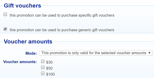 Want to offer a discount for your $100 vouchers, but not for your lower-value vouchers? No problem. In your promotion settings, under Voucher Amounts, simply check the voucher amounts you want the promo code to be valid for – as shown here.