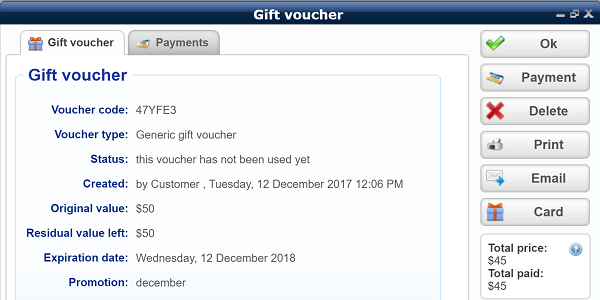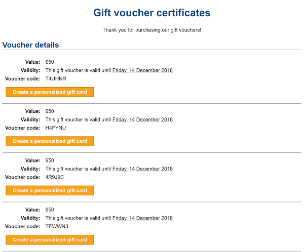 After the purchase, Bookeo sends the buyer an email with all the voucher details as shown below, including the ability to create a customized gift card for each different voucher.