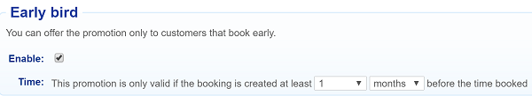 For example, you can offer a discount only to customers who make their bookings at least one month before the booked date.