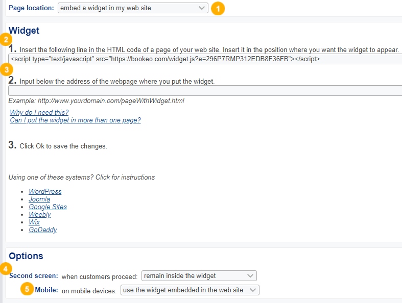 - In the Options section from the Mobile’s dropdown menu (number 5 on the image), and select either: use the widget embedded in the web site, or enlarge the widget to full screen