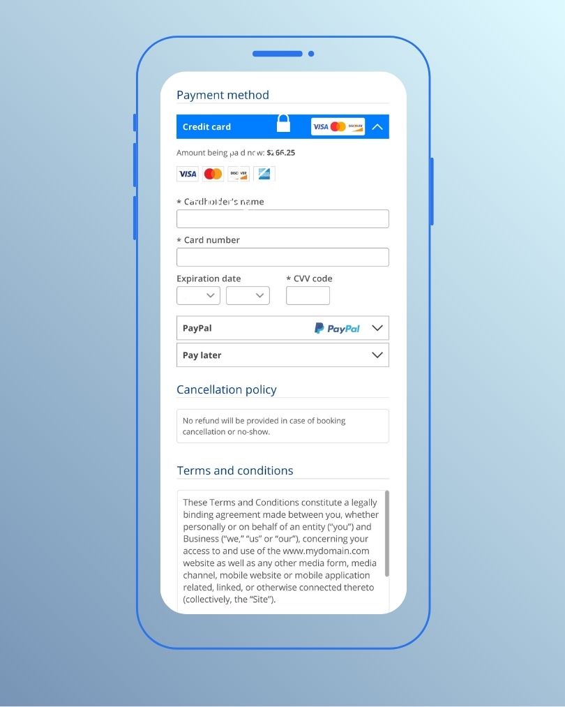 - Payment processing for deposits or full prepayments
