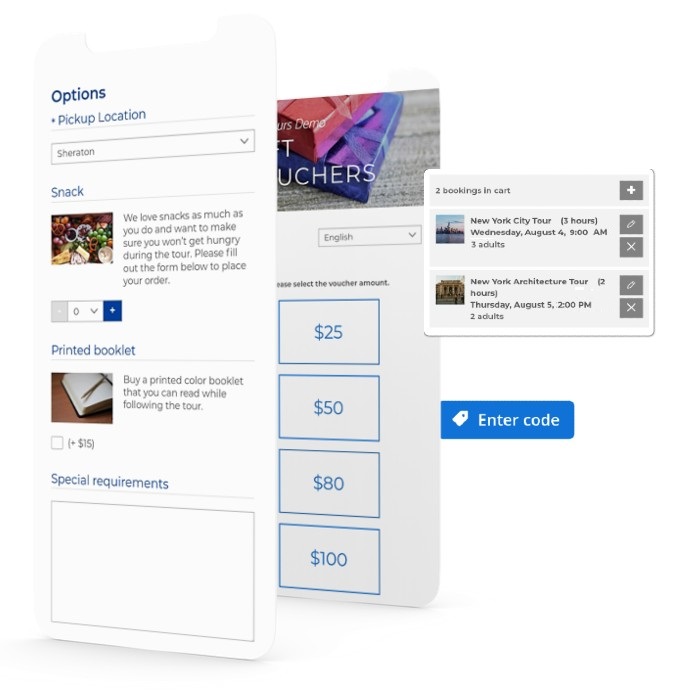 Upsell your tours and activities with extra and options like lunch and merchandise with our Resova alternative. Let customers book multiple tours with the integrated booking cart.